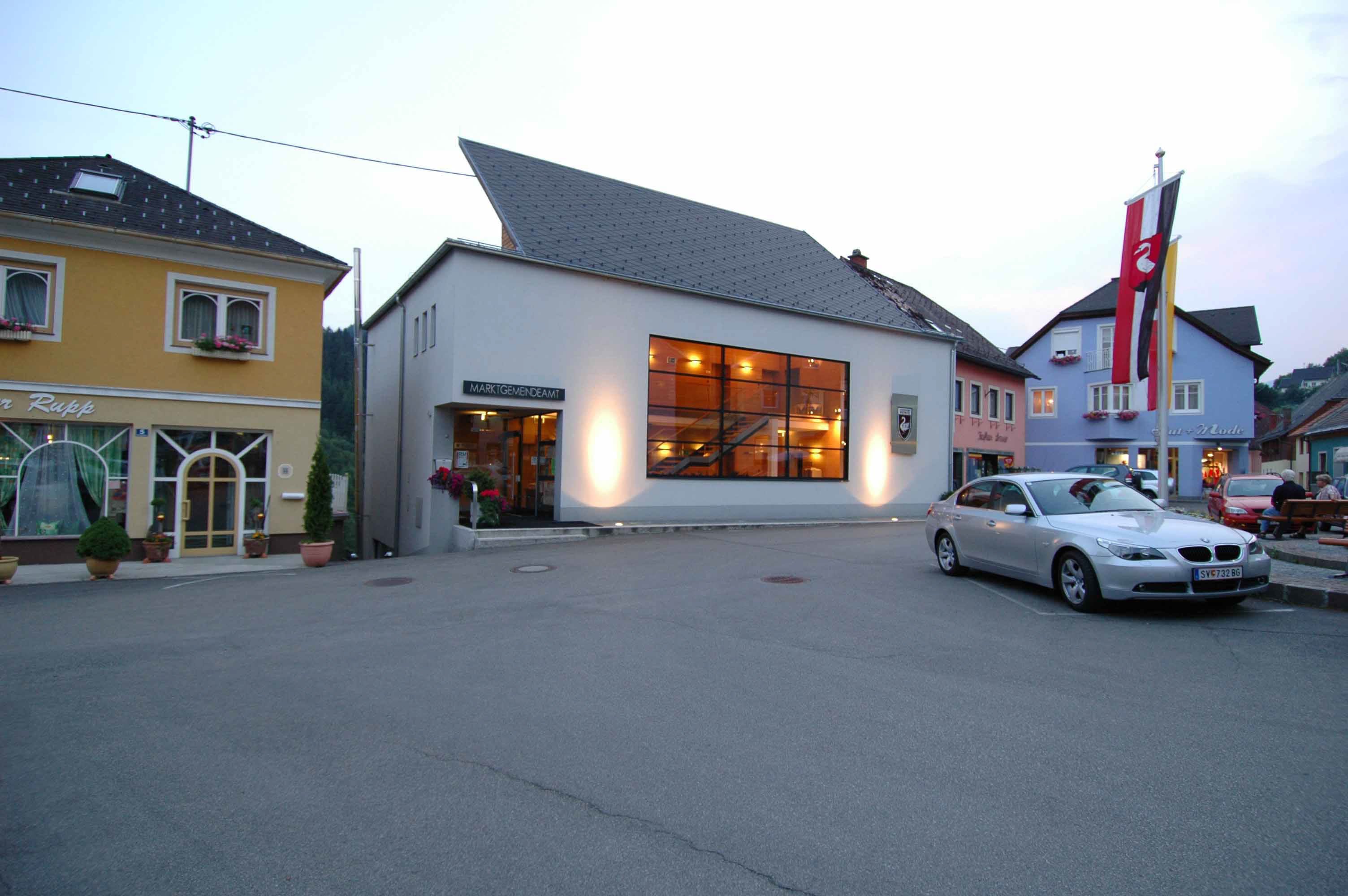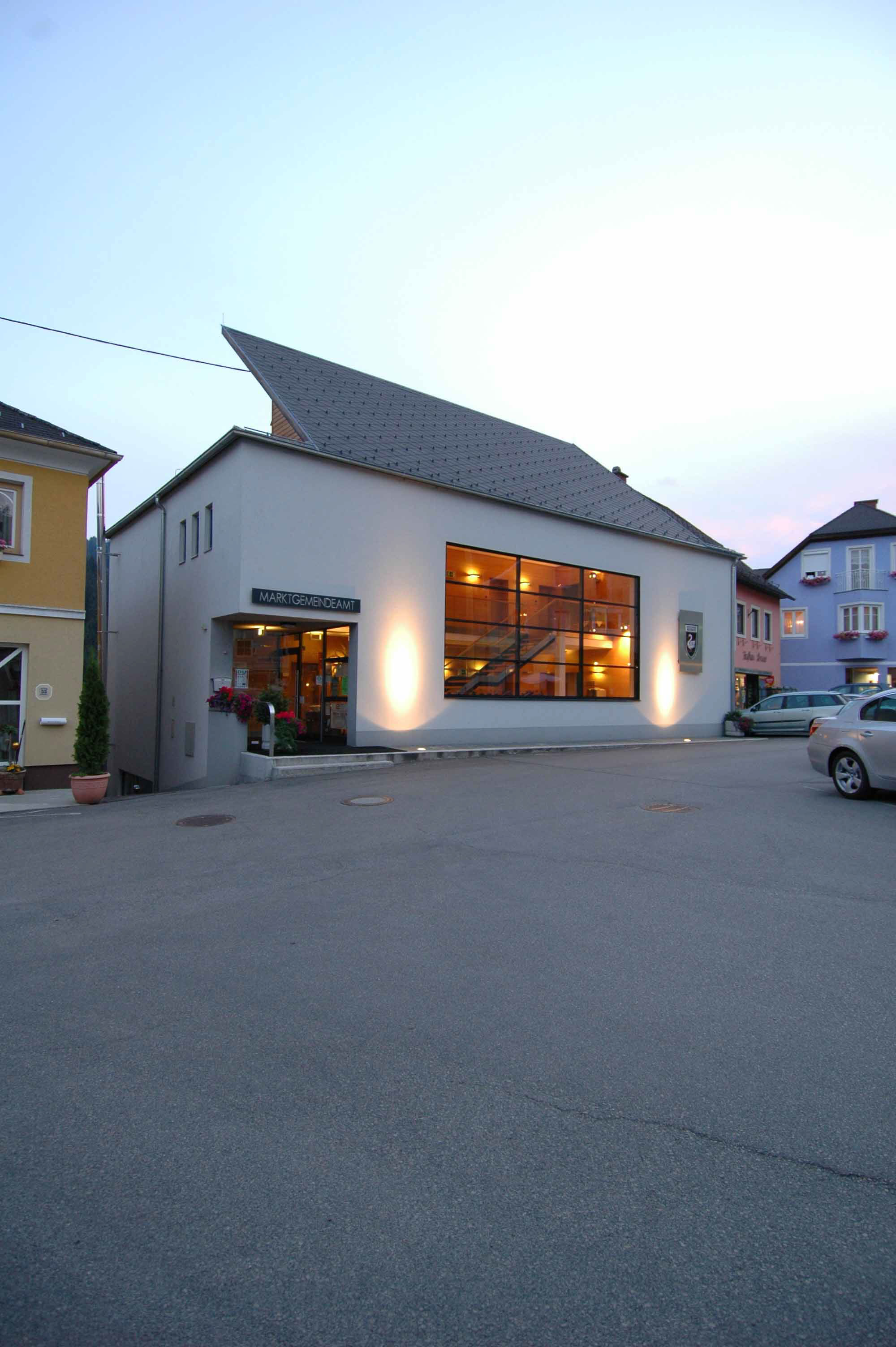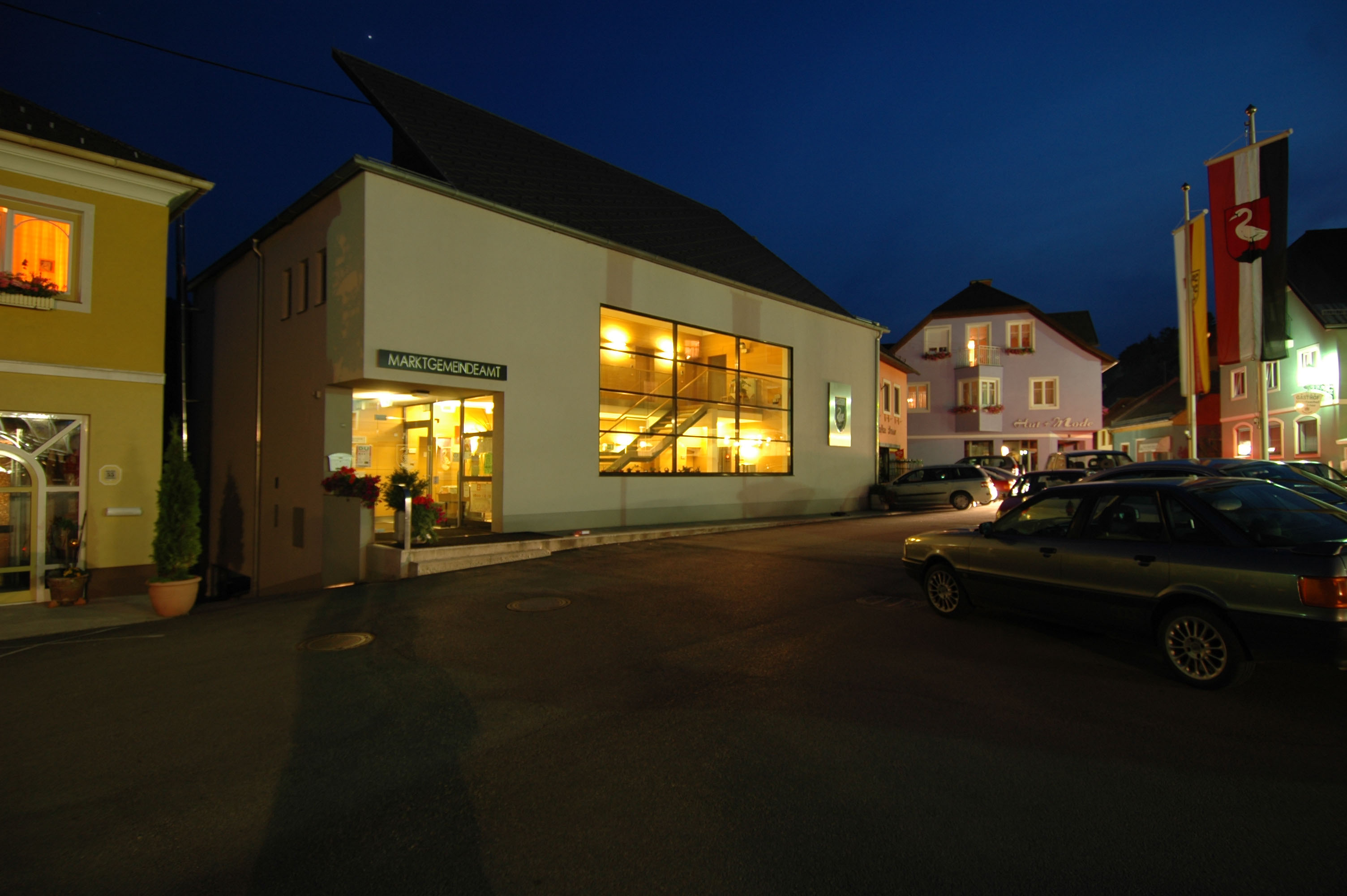 fassade und steildach fügen sich ins platzbild ein - die moderate gestaltung integriert das amtshaus in das ländlich geprägte umfeld. zur talseite wandelt sich der bau in eine fein durchgebildete holzstruktur, zeigt sich die dachschräge als sonnen-lichtfänger für das zum platz orientierte stiegenhaus. der aufgang zu den amtsräumen und der marktplatz sind durch das grosse fenster in eine wechselseitige beziehung gebracht.