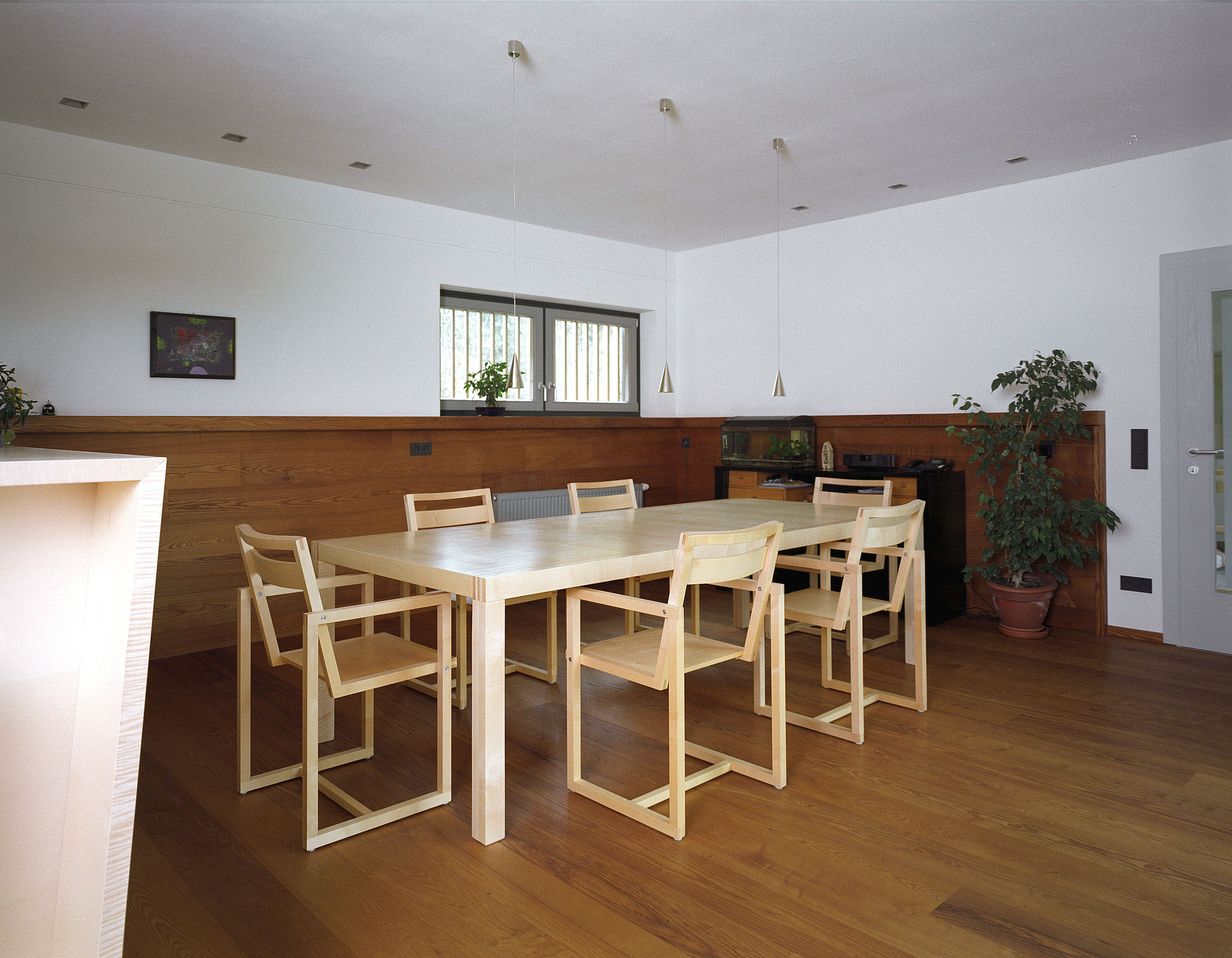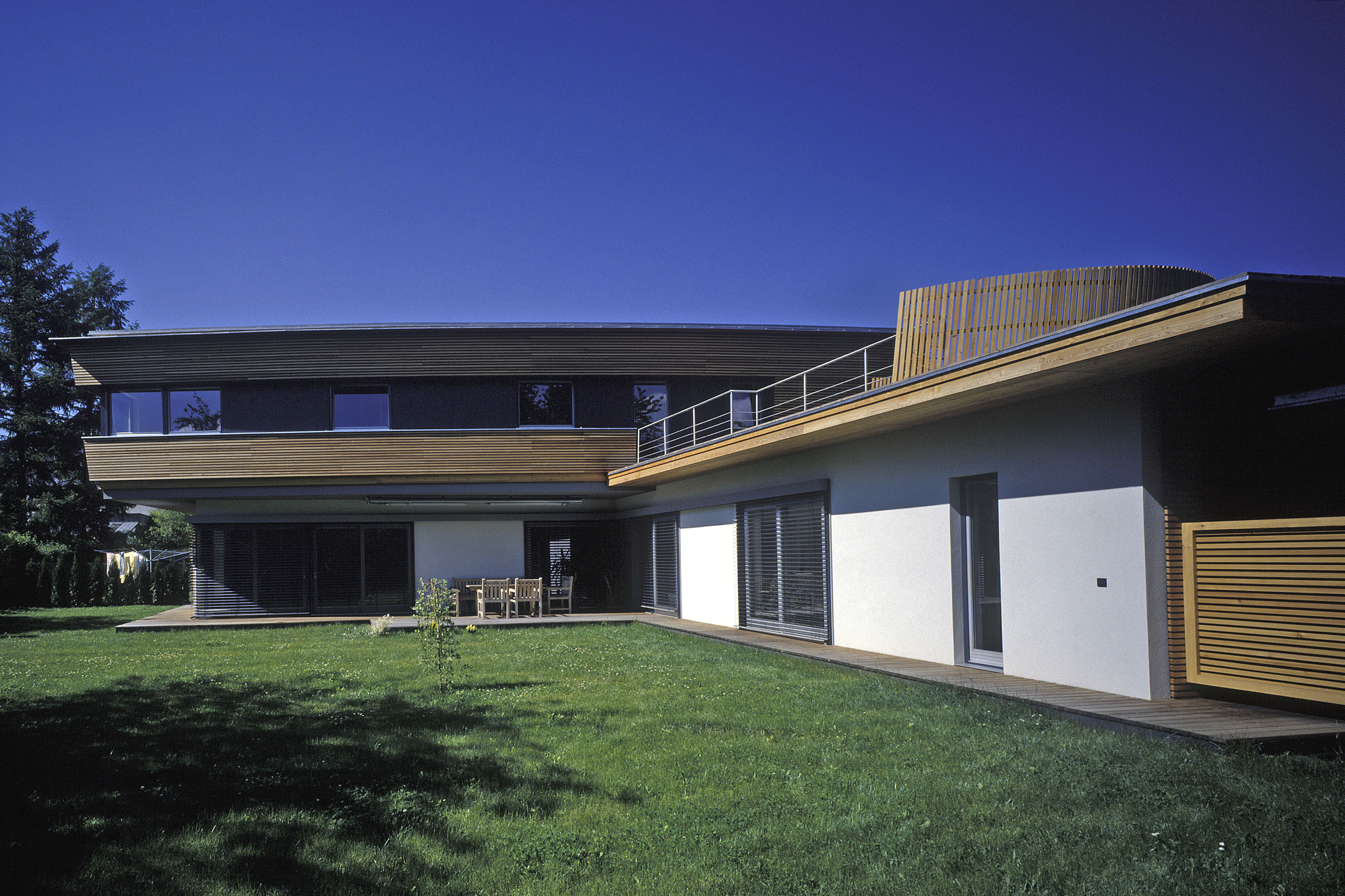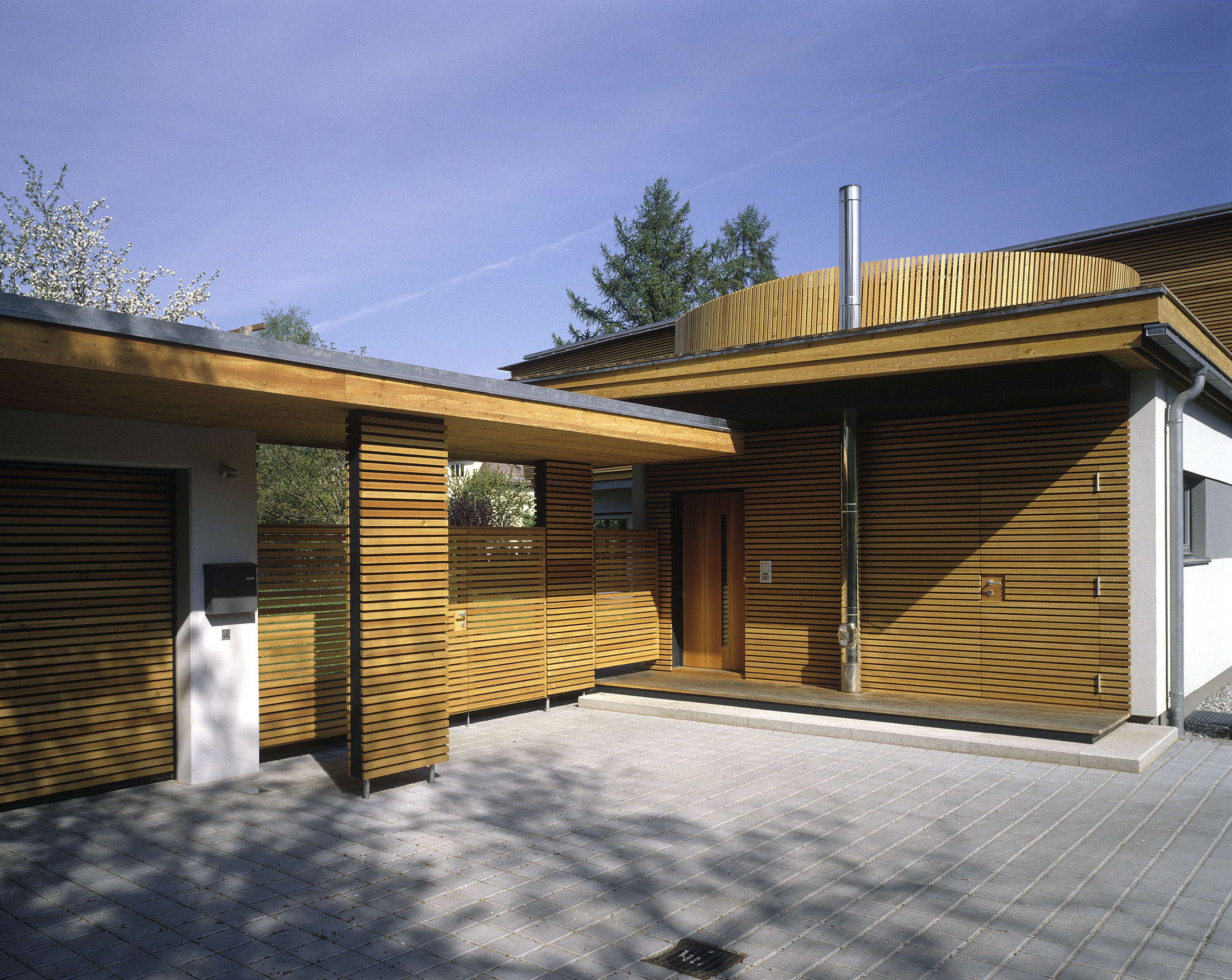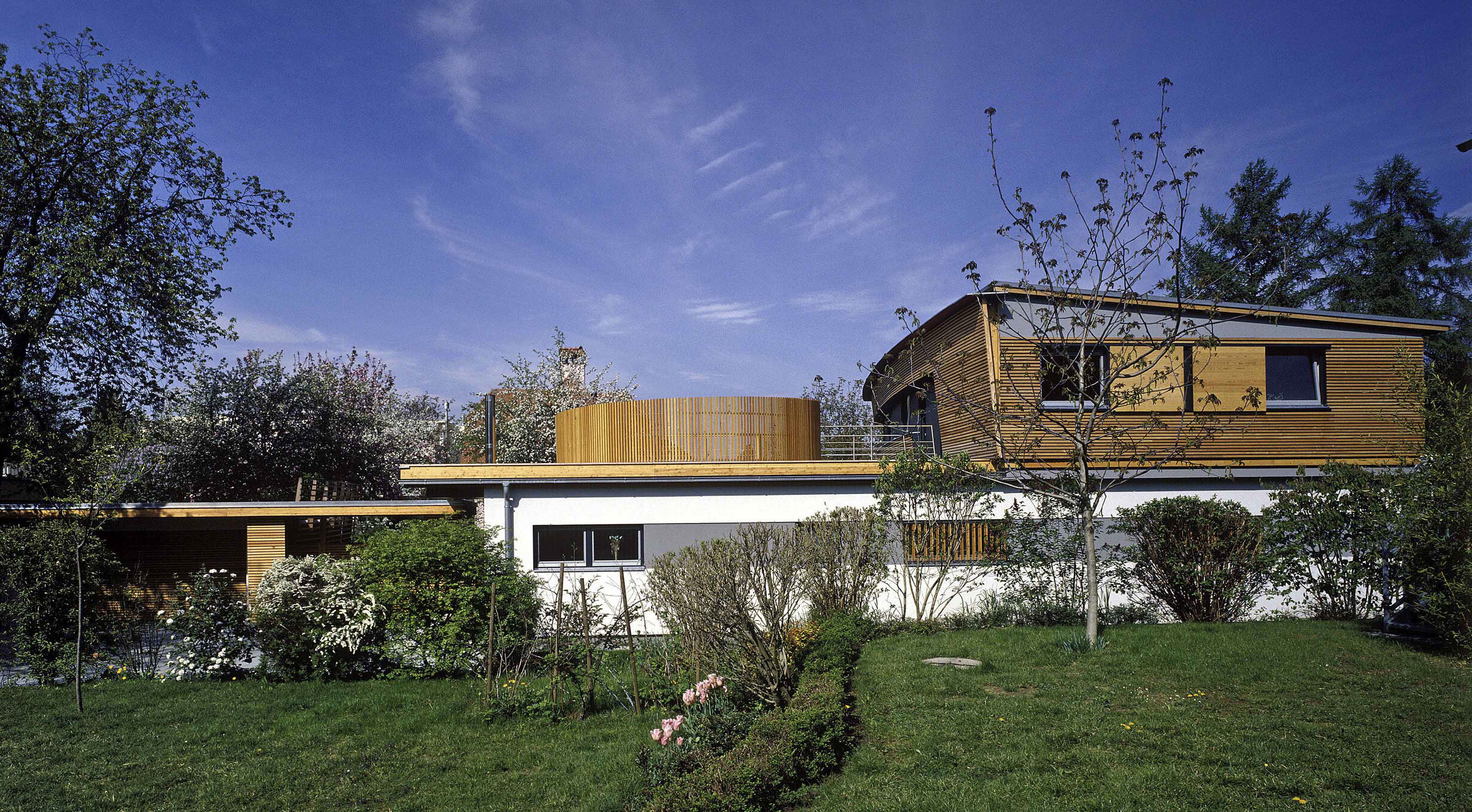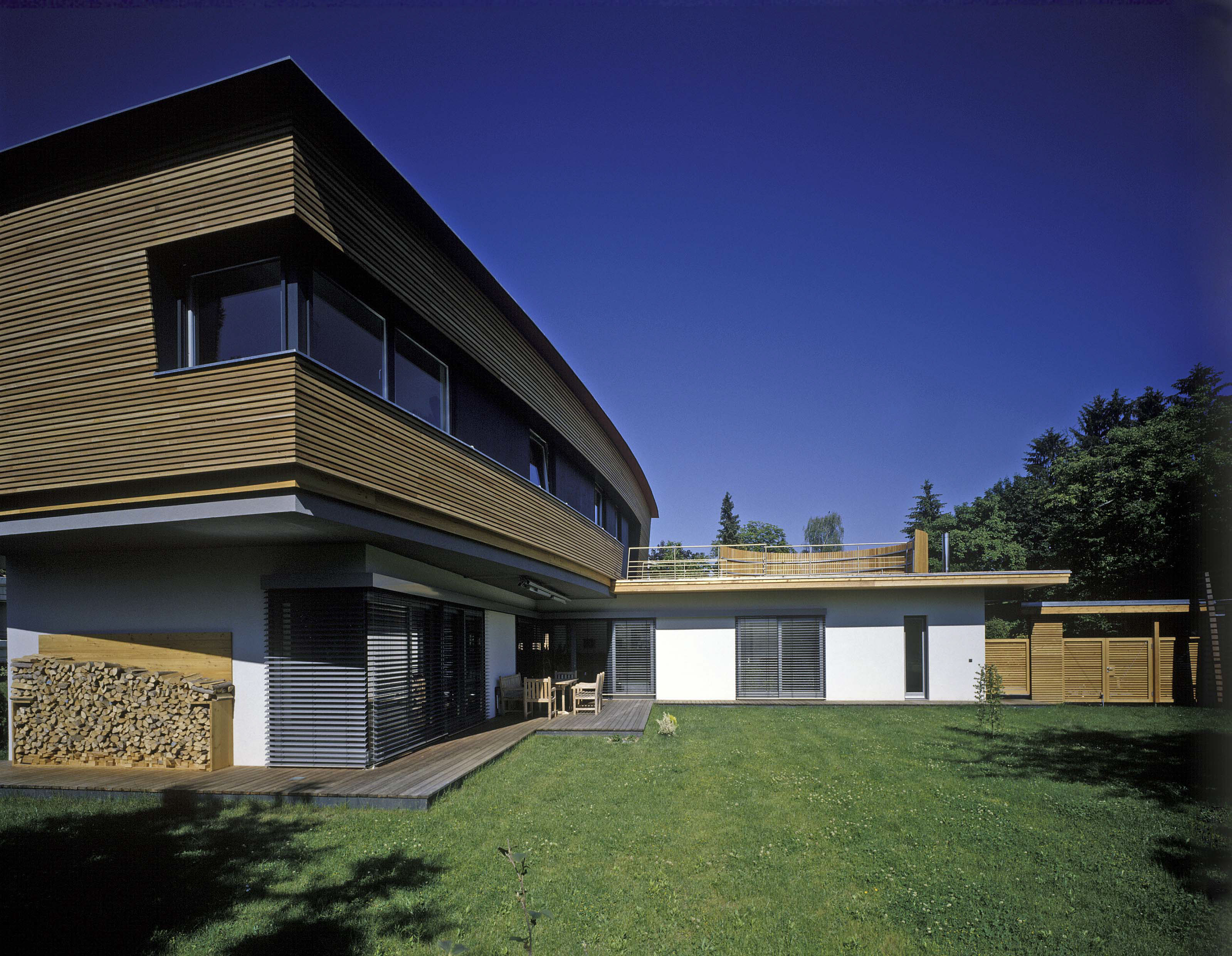 im zentrum aller planungen stand eine attraktive hofbildung. sie erweitert nun das erdgeschoss und bietet den bewohnern einen nach westen offenen "bewohnbaren außenraum". das hölzerne, auskragende obergeschoß gibt der fassade dynamik, veredelt sie. so nimmt das haus bezug auf die kultiviertheit vieler villenartiger bauten in seiner direkten umgebung.