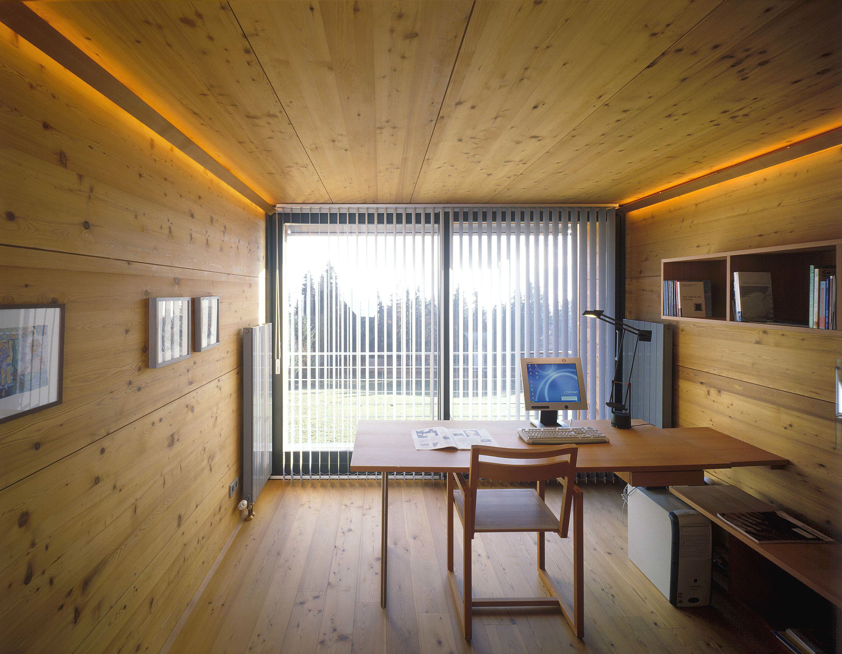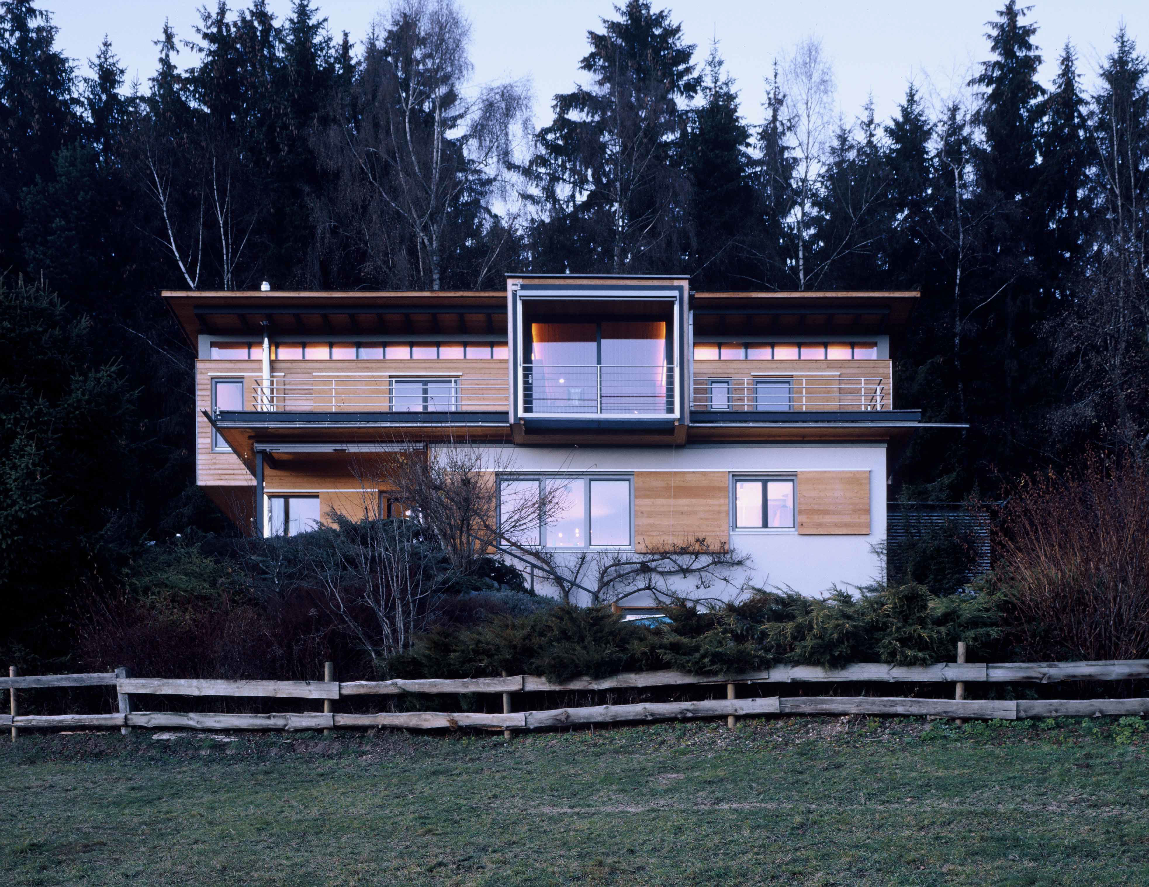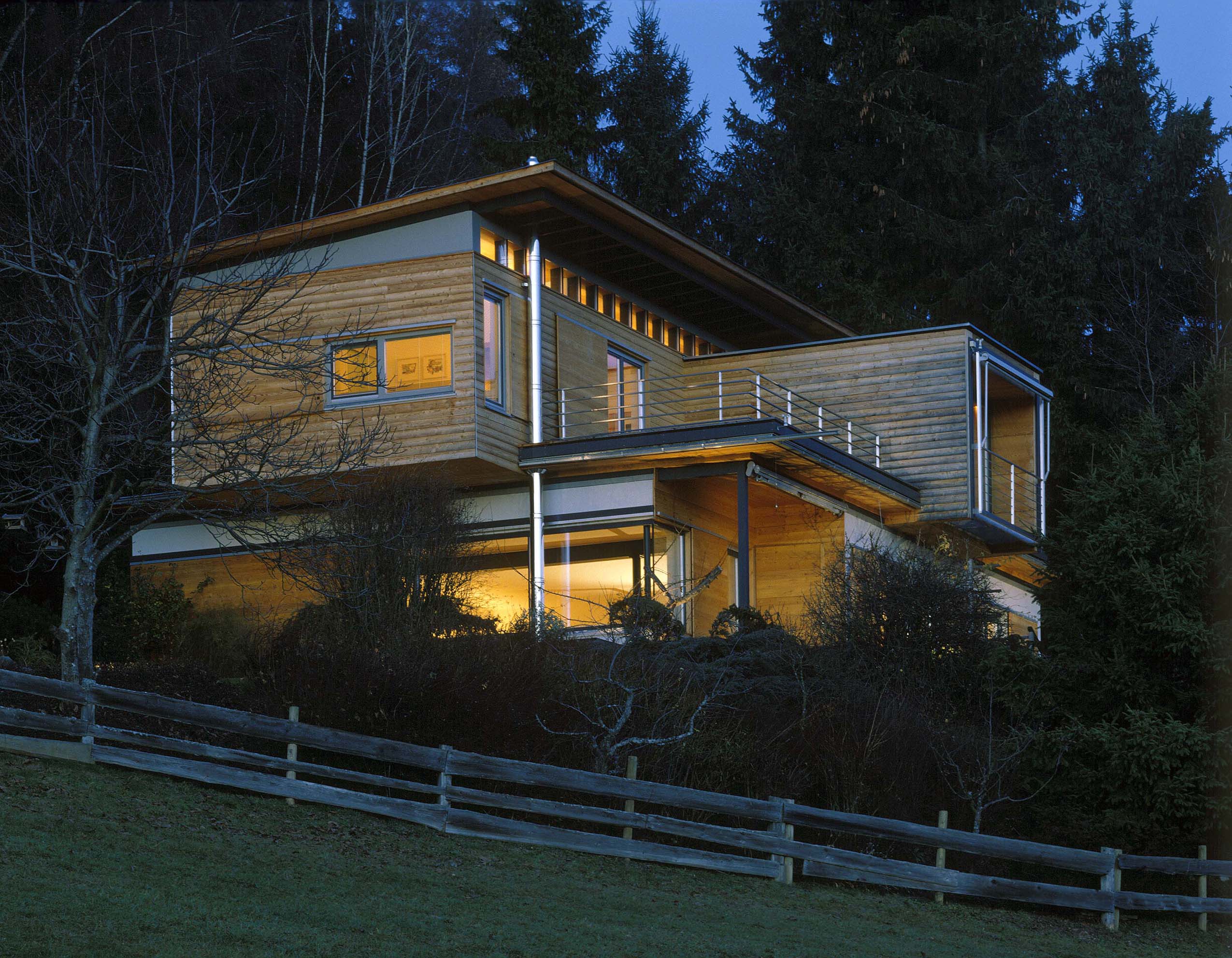 bei diesem umbau eines landhauses aus den 1970er jahren, wurde das obergeschoß abgebrochen und durch eine leichte holzkonstruktion ersetzt, aus der ein holzgetäfelter arbeitsraum ("landschaftsfernseher") herausragt. der ebenerdige wohnraum wurde durch eine großzügige übereckverglasung mit der fulminanten aussicht verknüpft. die holzmöbel wurden von den architekten entworfen.