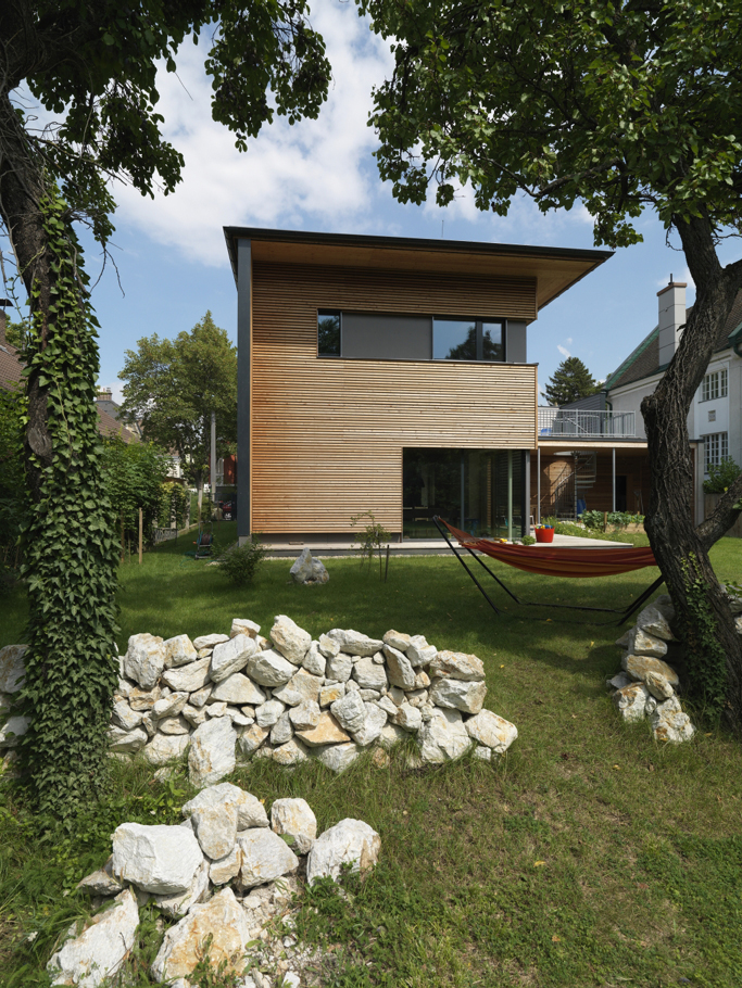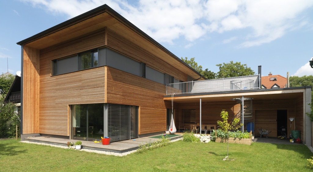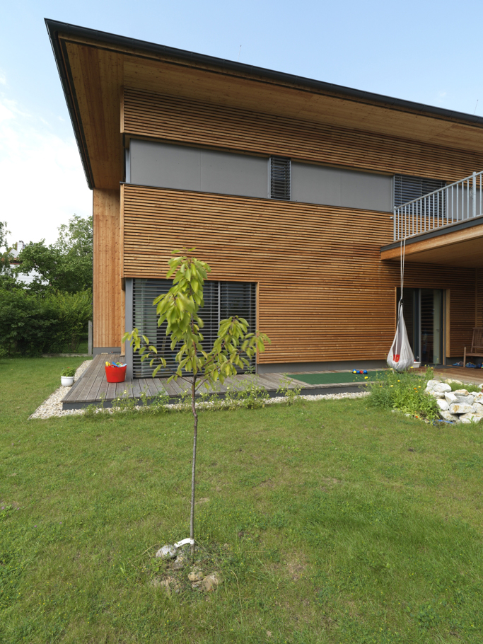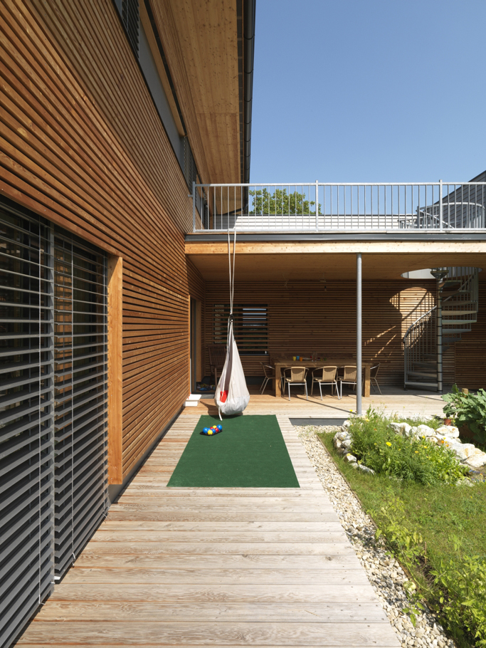 die klare gliederung von öffentlichen und privaten bereichen bietet den bewohnern eine behagliche wohnsituation auch im freien. das gebäude ist das erste in baden umgesetzte passivhaus. die bauzeit betrug lediglich 12 wochen.