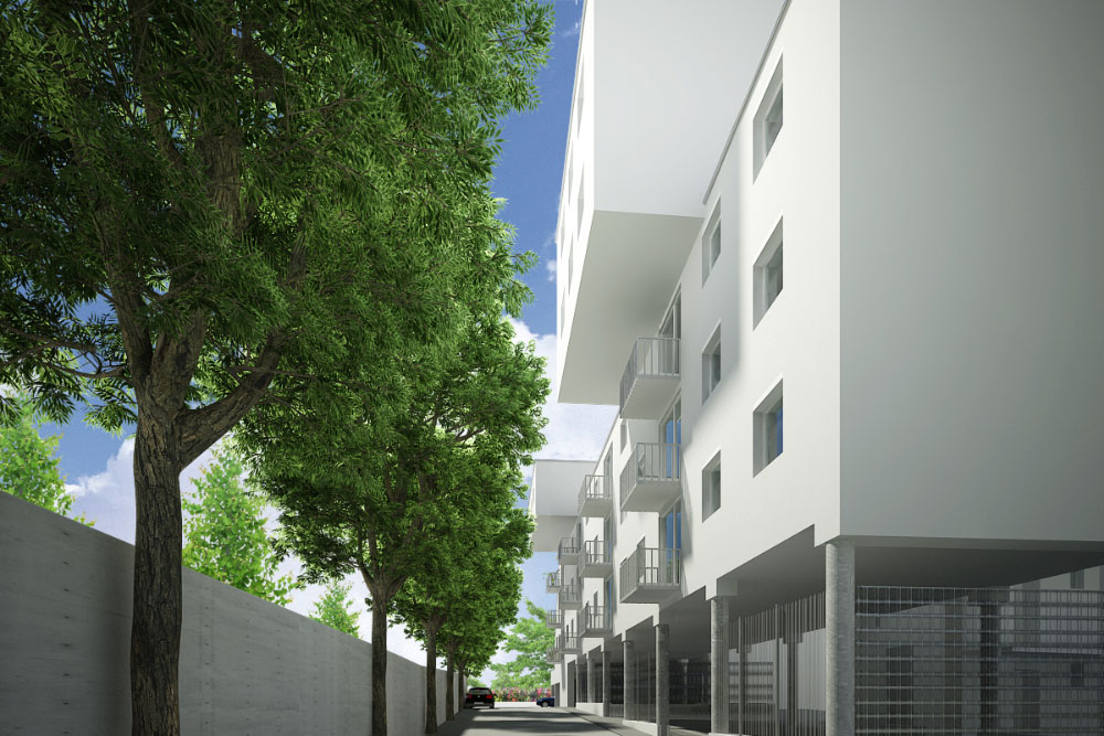 das erdgeschoss des straßenbegleitenden baukörpers nimmt infrastrukturräume wie kinderwagen- und fahrradräume sowie die entsorgungseinrichtungen auf. in diesem witterungsgeschützten bereich sind auch die eingänge angeordnet, von welchen man zwei an den baukörperschnittstellen situierte haupttreppen erreicht. ausgehend von den haupttreppen ist die gesamte anlage horizontal über laubengänge erschossen. in den nördlichen kammbaukörpern ist jeweils eine fluchtstiege angeordnet.