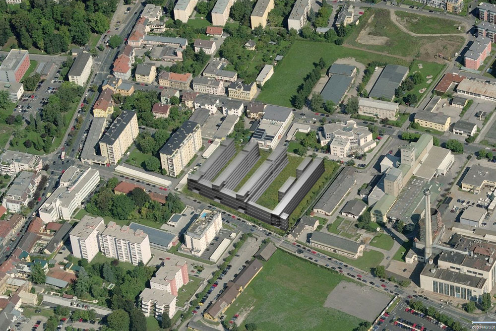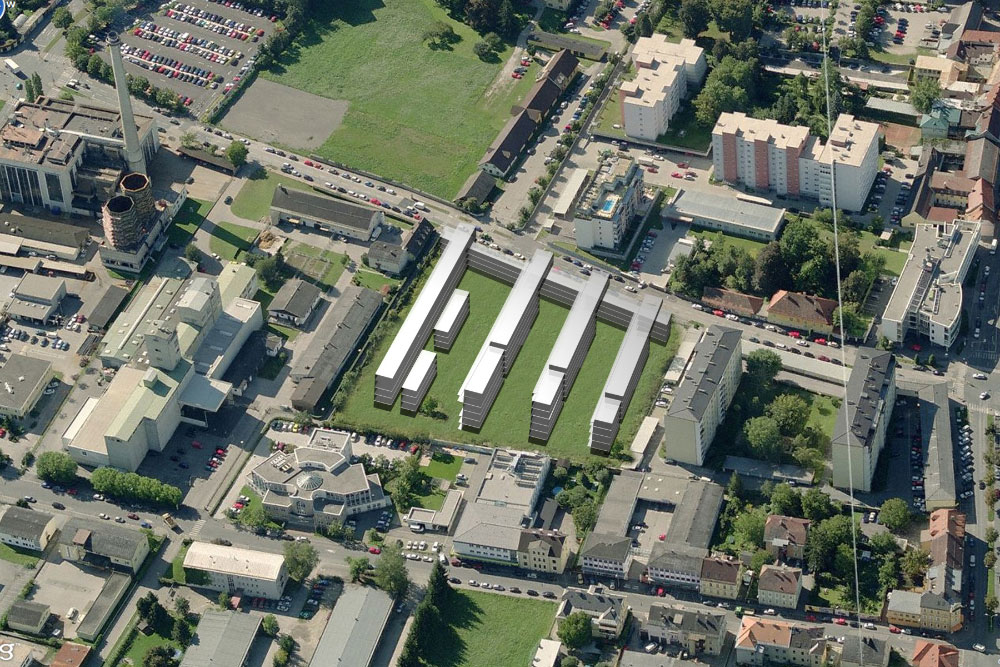 die kammförmig geformten baumassen und außenräume nehmen besondere rücksicht auf die umliegende bebauung, insbesondere die besonnung der nördlichen nachbarn war hier ein anliegen. dem westlichen nachbargebäude (krassniggstraße 31) sowie dem westlichen teil der künftigen kammbebauung wird durch die klagenfurter bebauungsverordnung ein sehr großzügiger gebäudeabstand eingeräumt.